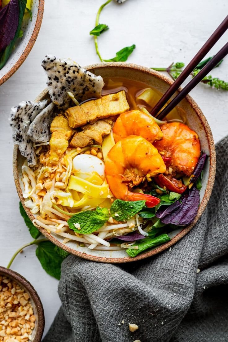 Quang Nam Province Noodle Dish. Vietnamese Udon-Style Noodles with Half Broth Topped with Pork Short Ribs, Shrimp, Boiled Egg