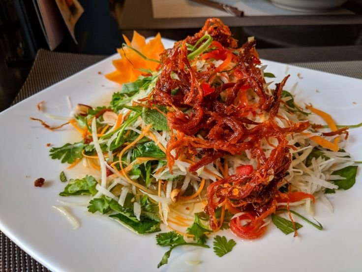 Green Papaya Salad with Beef Jerky, Herbs, Peanuts and House Sauce